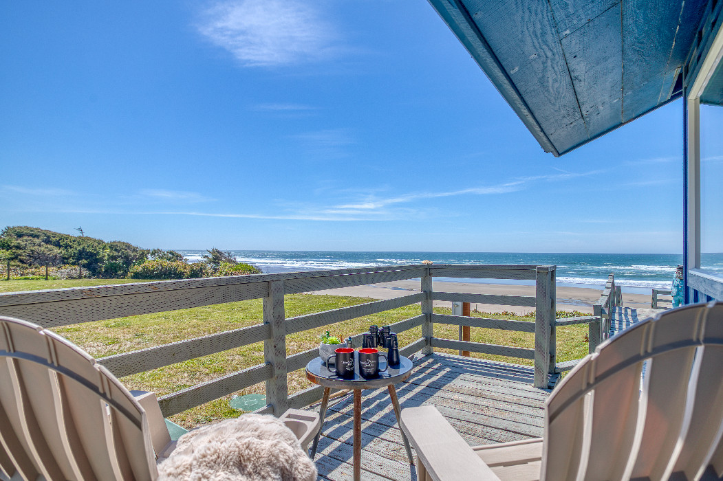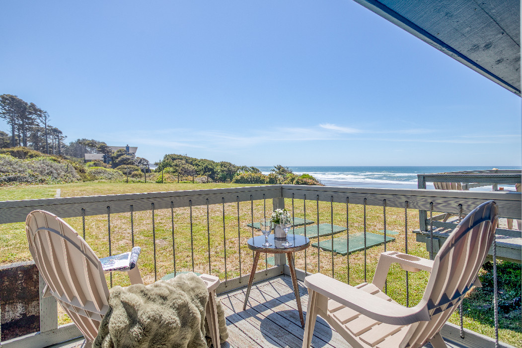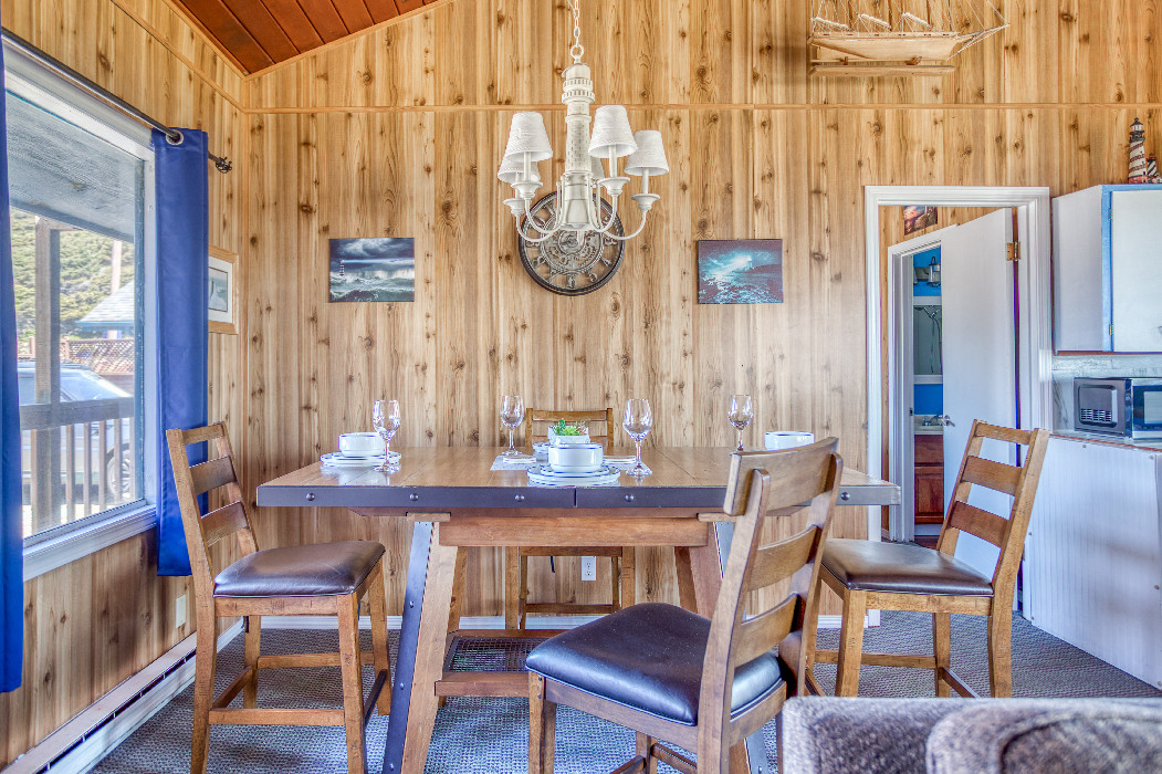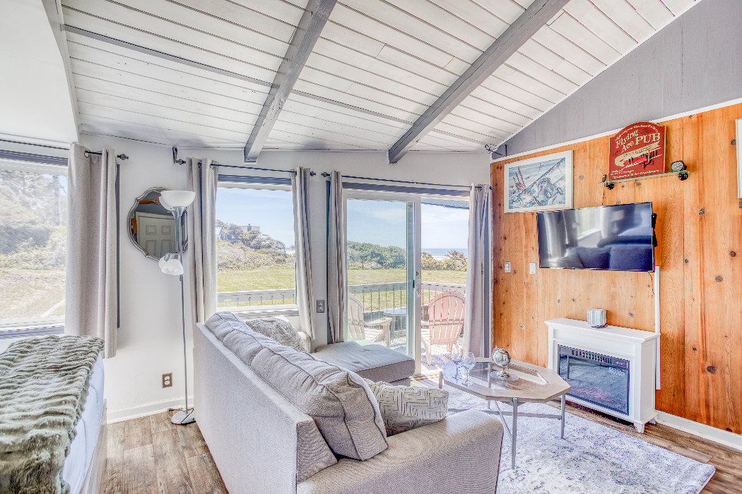 Feel like a local in our Oregon Room decorated in Oregon’s favorite state sports teams the Beavers and Ducks. This room offers a separate bedroom equipped with a king bed and a queen sofa sleeper in the living room and can comfortably accommodate up to 4 guests (2 adults and 2 children). The Oregon Room offers spectacular ocean views and comes with a deck, flat screen TV, and beamed ceilings. The full kitchen includes a microwave and coffee maker.