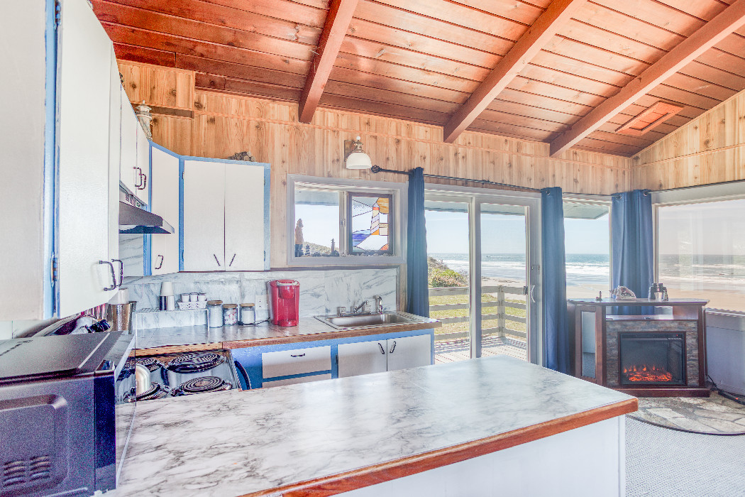 The Lighthouse Room offers a king bed in the master room and a sleeper sofa in the living room and can comfortably accommodate up to 4 guests (2 adults and 2 children). The Lighthouse Room provides spectacular views of the Pacific Ocean and the Yaquina Head Lighthouse. The Lighthouse Room is equipped with modern furnishings, a fireplace, deck, and a flat-screen TV. The full kitchen includes a microwave and coffee maker.