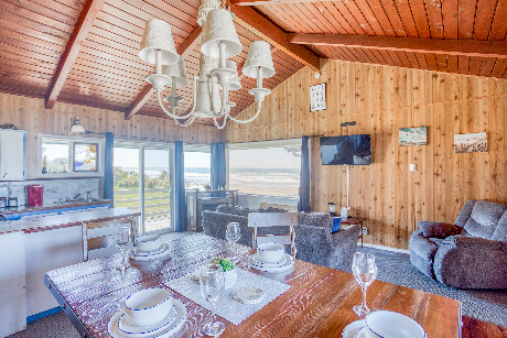 The Lighthouse Room offers a king bed in the master room and a sleeper sofa in the living room and can comfortably accommodate up to 4 guests (2 adults and 2 children).  The Lighthouse Room provides spectacular views of the Pacific Ocean and the Yaquina Head Lighthouse.  The Lighthouse Room is equipped with modern furnishings, a fireplace, deck, and a flat-screen TV.   The full kitchen includes a microwave and coffee maker.